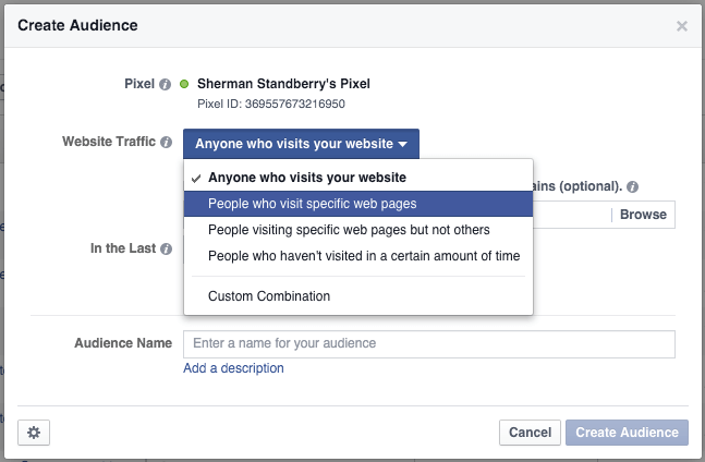 3. You will then be presented with several options to create your custom audience. For retargeting your website visitors, you’ll want to click the “website traffic” option and further specify the segmentation that best fits your needs.