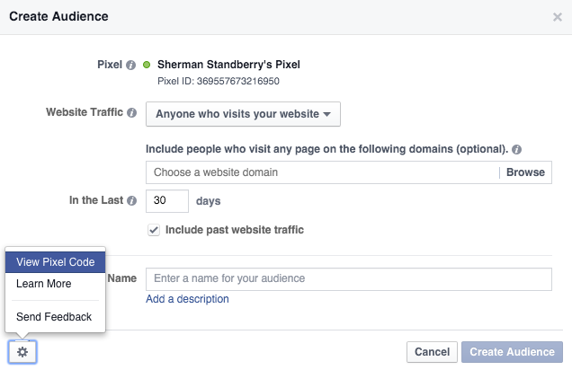 4. Assign a name to this custom audience, click the wheel near the bottom left and click view pixel.